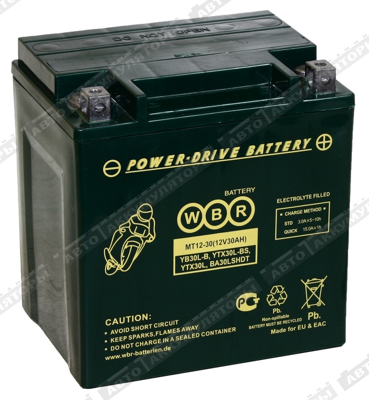 Аккумулятор WBR МТ12-30 - герметизированная, выполненная по технологии AGM, необслуживаемая (MF) стартерная мотоциклетная свинцово-кислотная аккумуляторная батарея. Обладает высоким качеством и надежностью. Она предназначена для запуска двигателя мотоциклов, скутеров, гидроциклов, квадроциклов, снегоходов и мотовездеходов. Батарея соответствует техническим характеристикам и является аналогом мотоциклетных аккумуляторных батарей YUASA моделей YB30L-B, YTX30L-BS, BA30LSHDT.