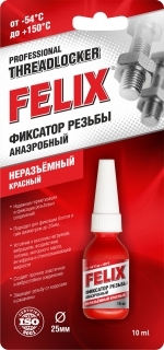 Профессиональный фиксатор резьбы Felix анаэробный неразъемный красный специально разработан для герметизации и фиксации резьбовых соединений. Представляет собой однокомпонентный анаэробный тиксотропный клей средне-высокой прочности для резьбовых соединений на основе акриловых полимеров. Отвердевает в безвоздушной среде между плотно прилегающими металлическими поверхностями и предотвращает ослабление соединений и протечку вследствие вибрации и ударов.